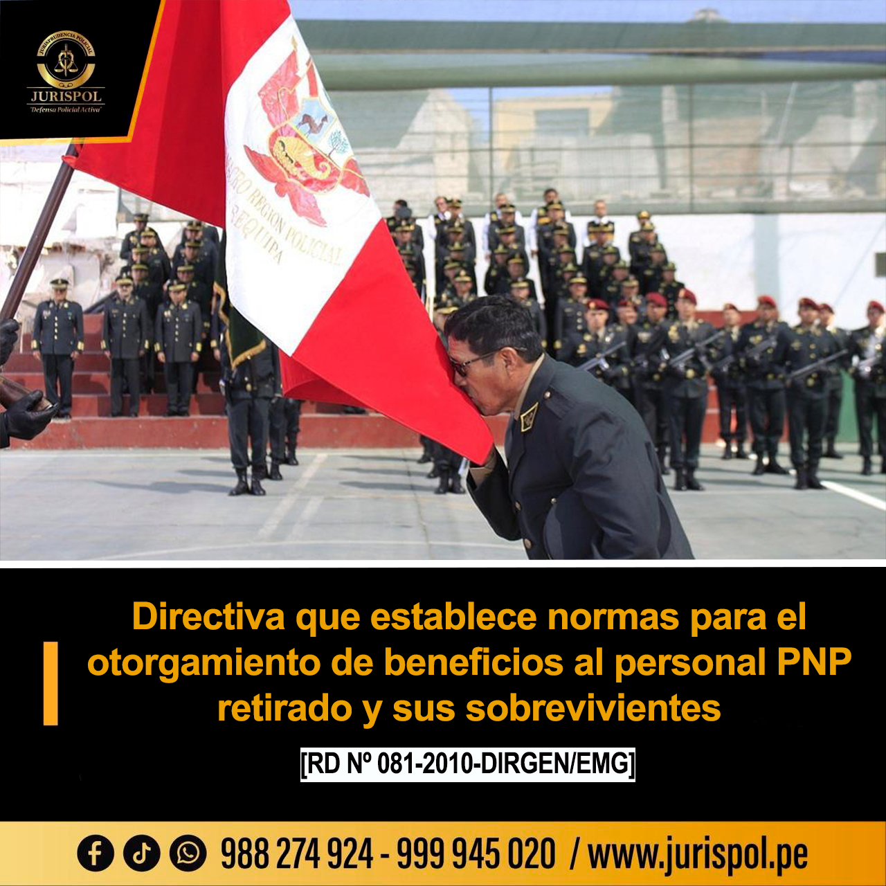 [Directivas PNP] Mediante la RD Nº 081-2010-DIRGEN/EMG, de fecha 05 de febrero de 2010, a través de Dirección General de la PNP, se aprobo la Directiva DGPNP 01 – 07 – 2010- DIRGEN-PNP- EMG-B «Directiva que establece normas y procedimientos para el otorgamiento de derechos y beneficios al personal PNP en situación de retiro, disponibilidad y sobrevivientes» ⇒DESCARGA AQUÍ⇐