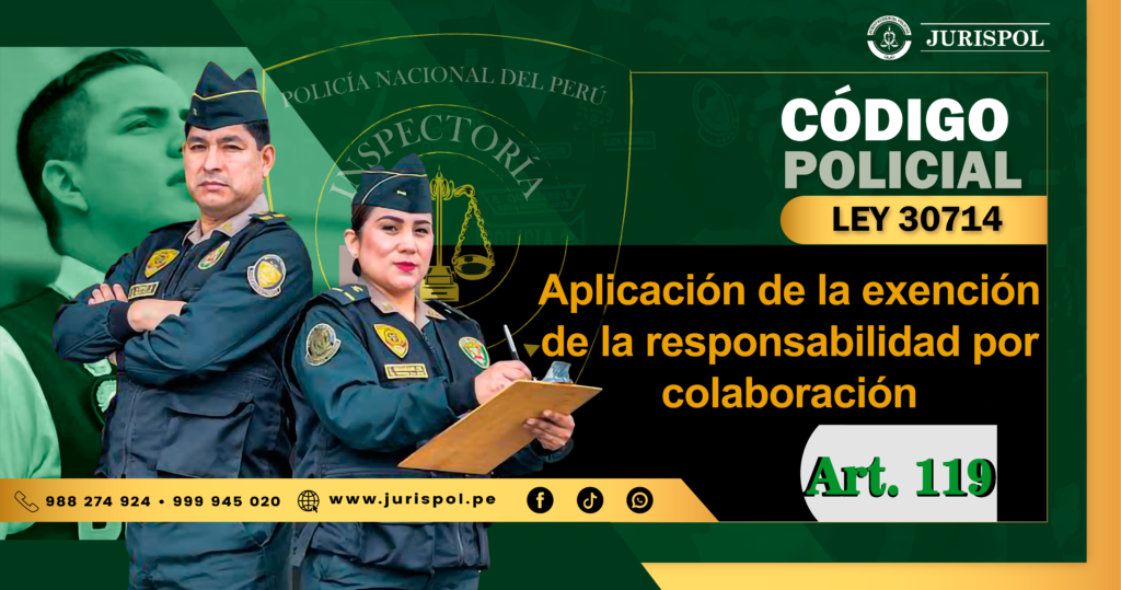 [Régimen Disciplinario de la PNP] En virtud del Reglamento de la Ley 30714, que regula el Régimen Disciplinario de la Policía Nacional del Perú, a través del área de redacción y el observatorio jurídico de Jurisprudencia Policial – JURISPOL, se ha elaborado Jurisprudencia actual y esencial al Reglamento del Régimen Disciplinario 30714, una selección estratégica de criterios que permiten comprender y aplicar correctamente esta normativa, particularmente el Art. 119. Aplicación de la exención de la responsabilidad por colaboración.