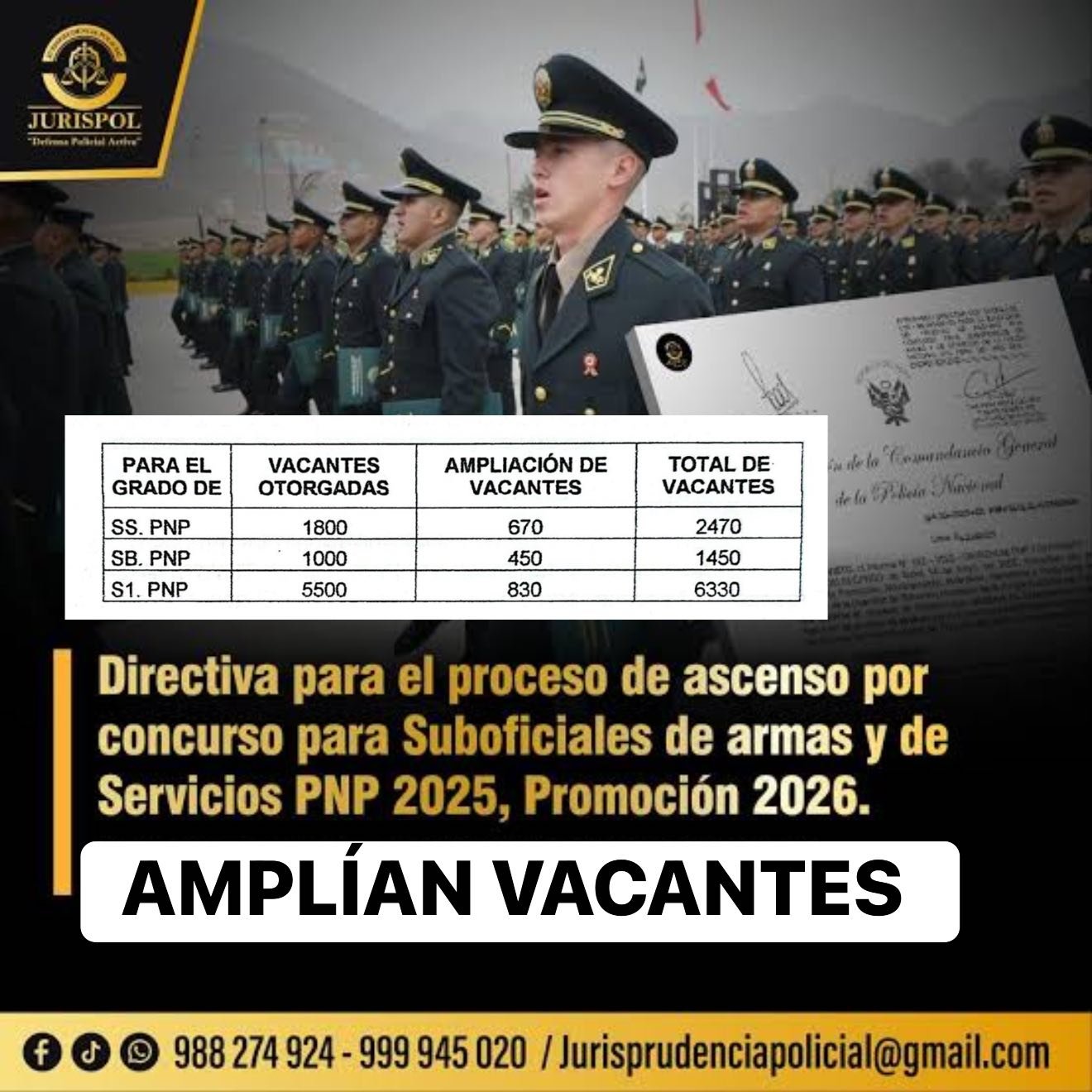 Que, con Informe N° 236-2025-DIRREHUM-PNP/SEC-UNIPLEDU.ADO del 7 de noviembre de 2025, la Unidad de Planeamiento y Educación de la Dirección de Recursos Humanos de la Policía Nacional del Perú, ha propuesto al Alto Mando Institucional la ampliación del número de vacantes otorgadas a los Suboficiales de Armas de la Policía Nacional del Perú en el Proceso de Ascenso por Concurso de Suboficiales de Armas y de Servicios de la Policía Nacional del Perú, del año 2025 – Promoción 2026, para el ascenso a los grados de Suboficial Superior, Suboficial Brigadier, y Suboficial de Primera; teniendo en consideración no solo el beneficio del personal policial, sino también para hacer uso adecuado de los recursos asignados a la Policía Nacional del Perú y evitando así la devolución del presupuesto al tesoro público;