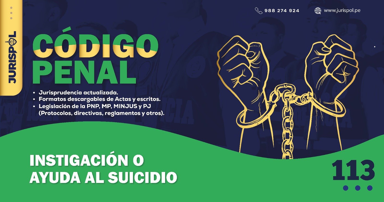 [Código Penal] En virtud del Decreto Legislativo 635, se promulgó el CÓDIGO PENAL PERUANO, a través del área de redacción y el observatorio jurídico de Jurisprudencia Policial – JURISPOL, se ha elaborado Jurisprudencia actual y esencial, una selección estratégica de criterios que permiten comprender y aplicar correctamente esta normativa, particularmente el Art. 113 .- Instigación o ayuda al suicidio.