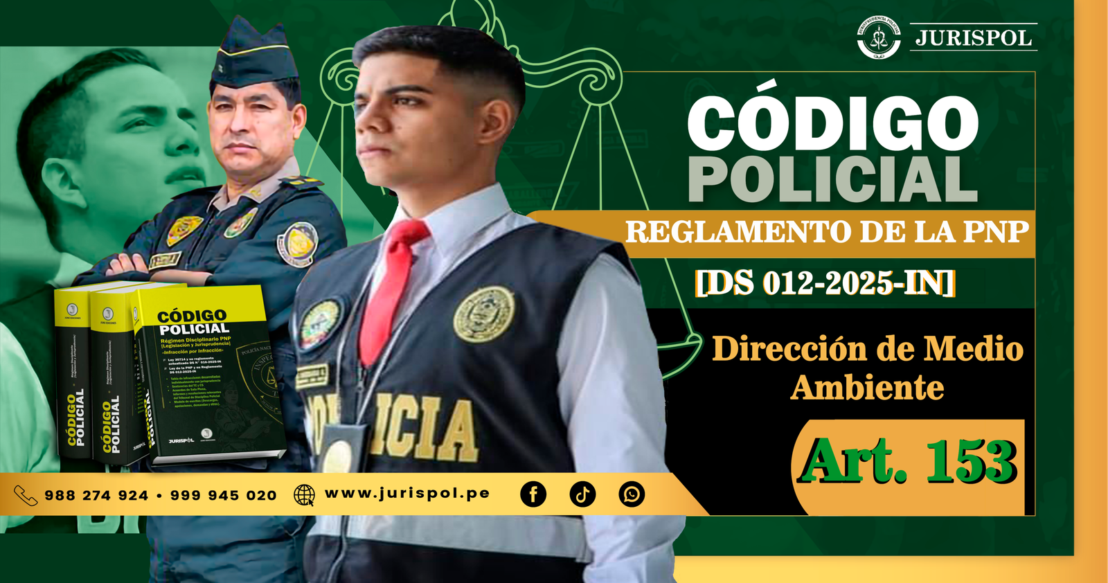 [Reglamento de la Ley de la PNP] Mediante el DS 012-2025-IN, publicado el 05NOV2025, se aprobó el Reglamento de la Ley de la Policía Nacional del Perú; a través del área de redacción y observatorio jurídico de Jurisprudencia Policial – JURISPOL, se ha elaborado y seleccionado criterios estratégicos que permiten aplicar correctamente esta normativa. Artículo 153. Dirección de Medio Ambiente.