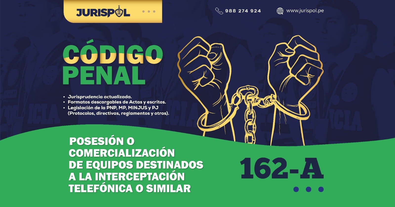 [Código Penal] En virtud del Decreto Legislativo 635, se promulgó el CÓDIGO PENAL PERUANO, a través del área de redacción y el observatorio jurídico de Jurisprudencia Policial – JURISPOL, se ha elaborado Jurisprudencia actual y esencial, una selección estratégica de criterios que permiten comprender y aplicar correctamente esta normativa, particularmente el Art. 162 – A.- Posesión o comercialización de equipos destinados a la interceptación telefónica o similar.