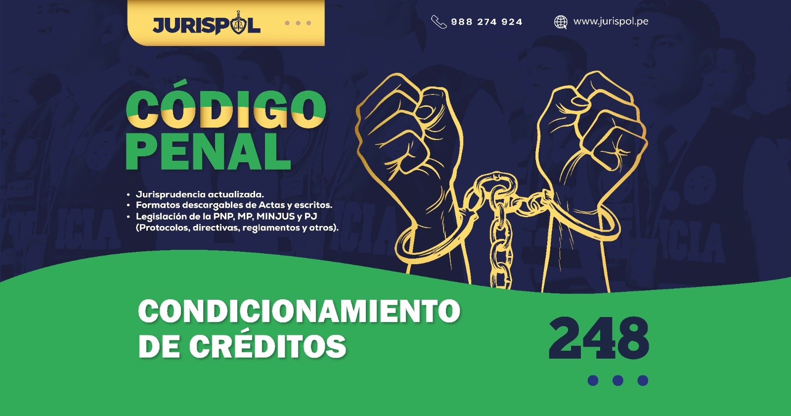 [Código Penal] En virtud del Decreto Legislativo 635, se promulgó el CÓDIGO PENAL PERUANO, a través del área de redacción y el observatorio jurídico de Jurisprudencia Policial – JURISPOL, se ha elaborado Jurisprudencia actual y esencial, una selección estratégica de criterios que permiten comprender y aplicar correctamente esta normativa, particularmente el Art. 248.-Condicionamiento de créditos.