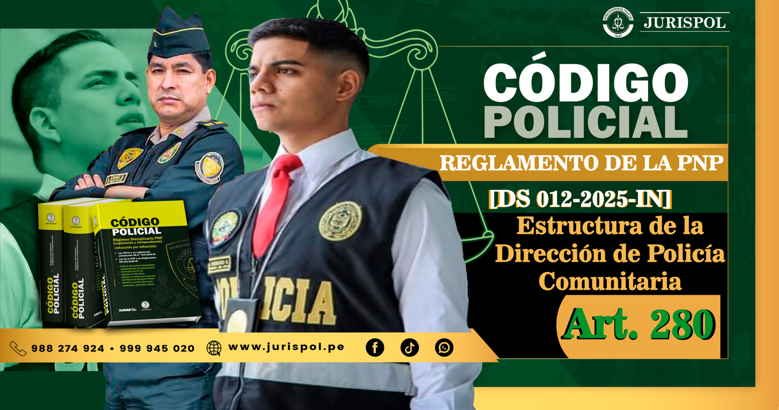 [Reglamento de la Ley de la PNP] Mediante el DS 012-2025-IN, publicado el 05NOV2025, se aprobó el Reglamento de la Ley de la Policía Nacional del Perú; a través del área de redacción y observatorio jurídico de Jurisprudencia Policial – JURISPOL, se ha elaborado y seleccionado criterios estratégicos que permiten aplicar correctamente esta normativa. Artículo 280. Estructura de la Dirección de Policía Comunitaria.