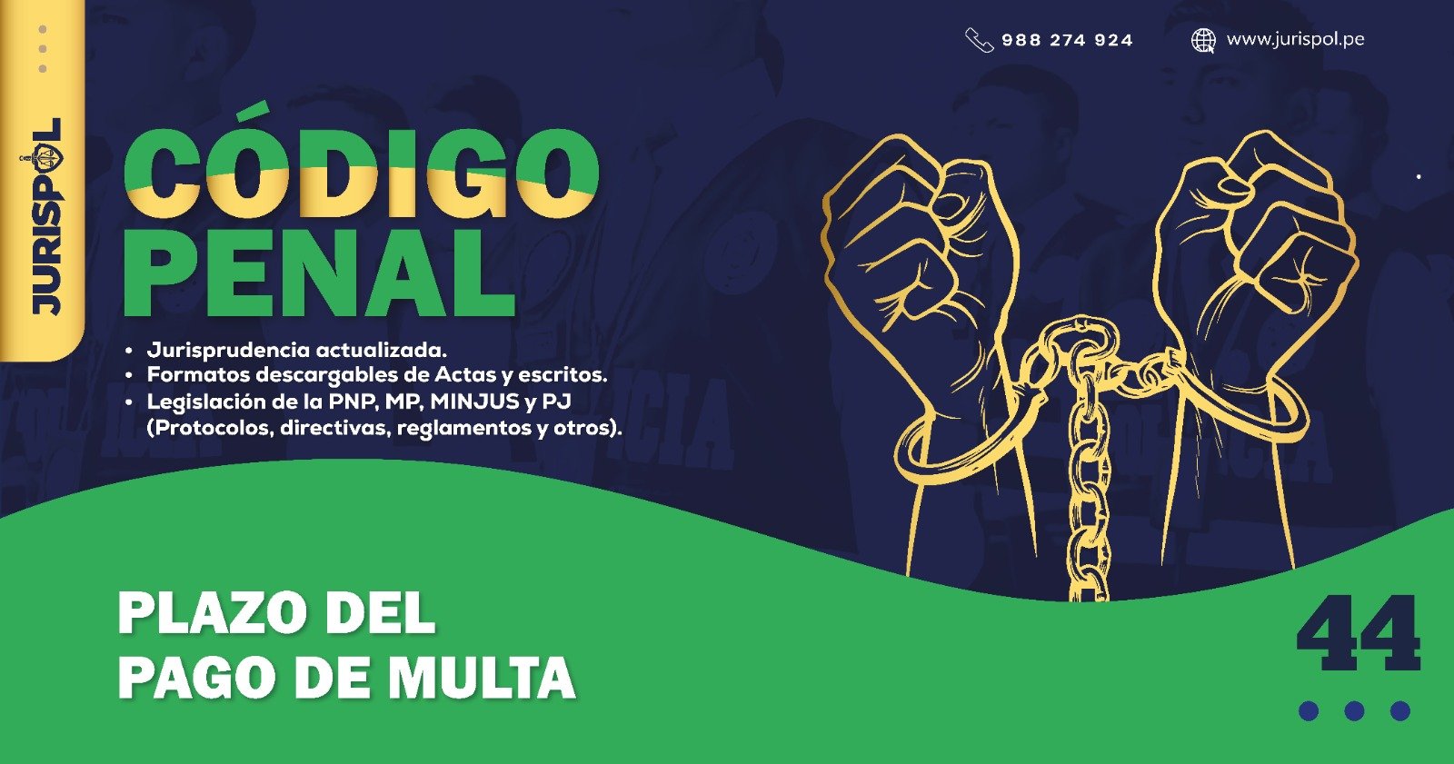[Código Penal] En virtud del Decreto Legislativo 635, se promulgó el CÓDIGO PENAL PERUANO, a través del área de redacción y el observatorio jurídico de Jurisprudencia Policial – JURISPOL, se ha elaborado Jurisprudencia actual y esencial, una selección estratégica de criterios que permiten comprender y aplicar correctamente esta normativa, particularmente el Art. 44 . Plazo del pago de multa.