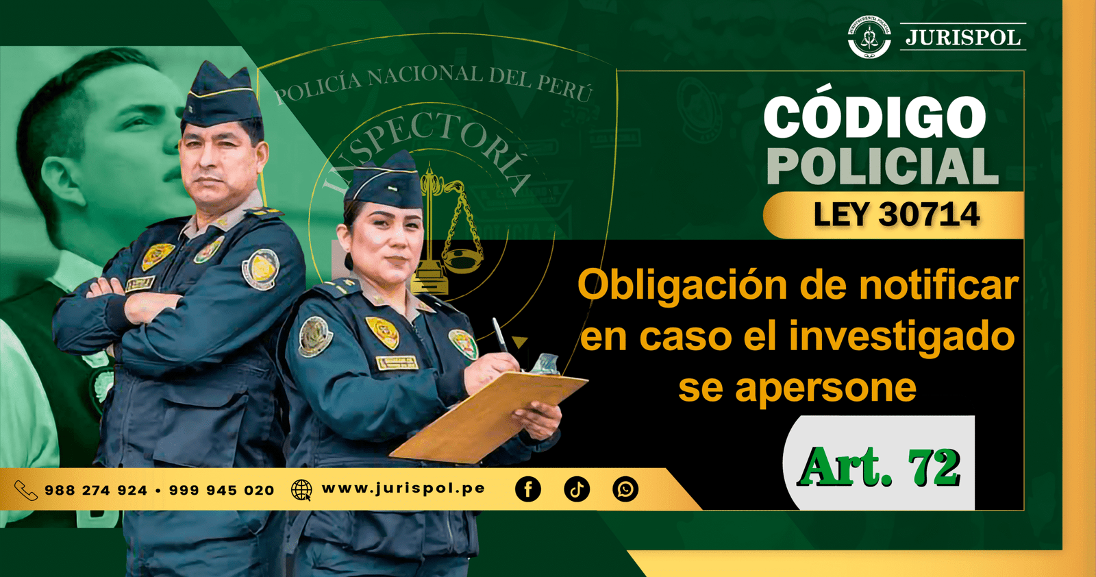 [Régimen Disciplinario de la PNP] En virtud del Reglamento de la Ley 30714, que regula el Régimen Disciplinario de la Policía Nacional del Perú, a través del área de redacción y el observatorio jurídico de Jurisprudencia Policial – JURISPOL, se ha elaborado Jurisprudencia actual y esencial al Reglamento del Régimen Disciplinario 30714, una selección estratégica de criterios que permiten comprender y aplicar correctamente esta normativa, particularmente el Art. 72. Obligación de notificar en caso el investigado se apersone.