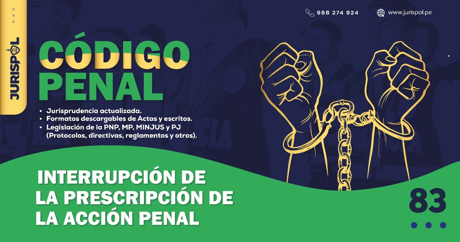 [Código Penal] En virtud del Decreto Legislativo 635, se promulgó el CÓDIGO PENAL PERUANO, a través del área de redacción y el observatorio jurídico de Jurisprudencia Policial – JURISPOL, se ha elaborado Jurisprudencia actual y esencial, una selección estratégica de criterios que permiten comprender y aplicar correctamente esta normativa, particularmente el Art. 83 .Interrupción de la prescripción de la acción penal.