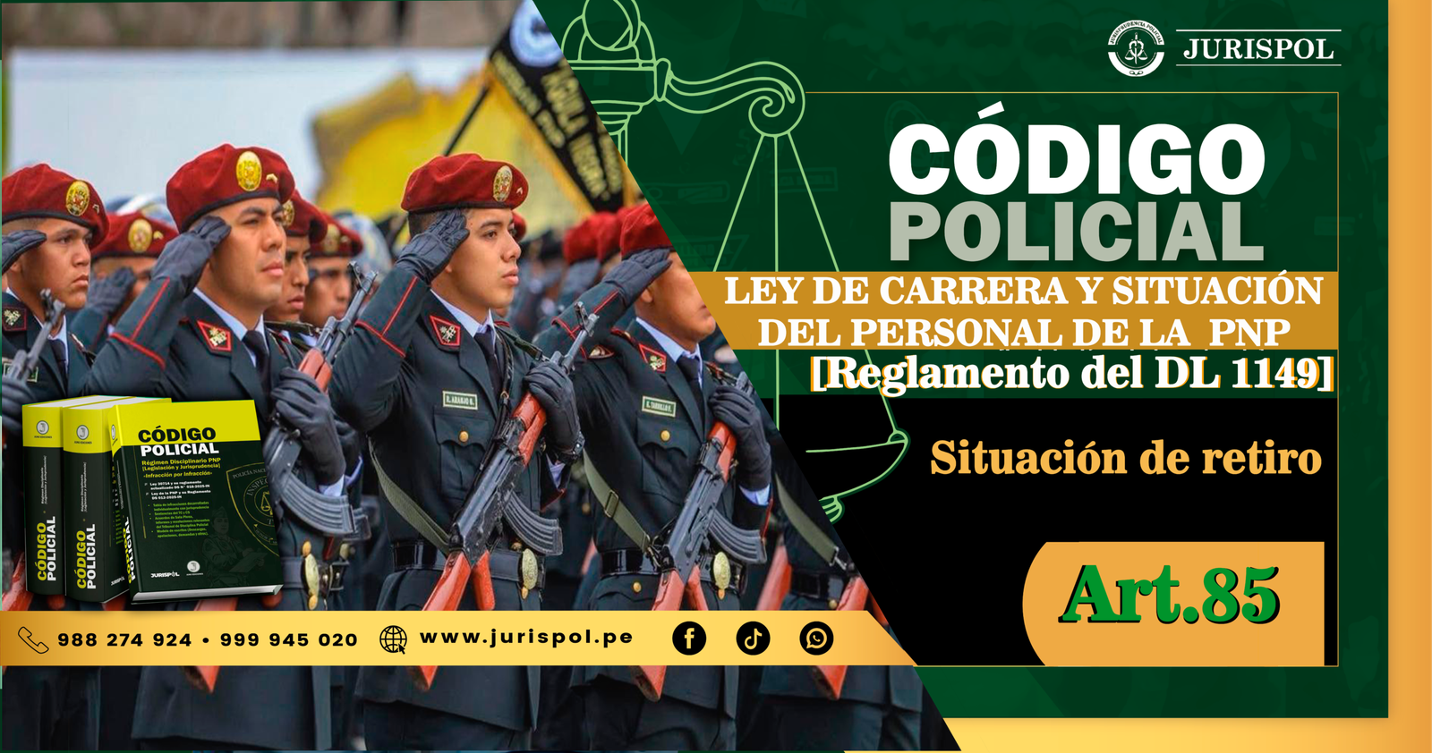 [Reglamento del DL 1149] Mediante el DS 016-2013-IN, publicado el 17NOV2013, se aprobó el Reglamento del Decreto Legislativo 1149; a través del área de redacción y observatorio jurídico de Jurisprudencia Policial – JURISPOL, se ha elaborado y seleccionado criterios estratégicos que permiten aplicar correctamente esta normativa. Artículo 85.- Situación de retiro.