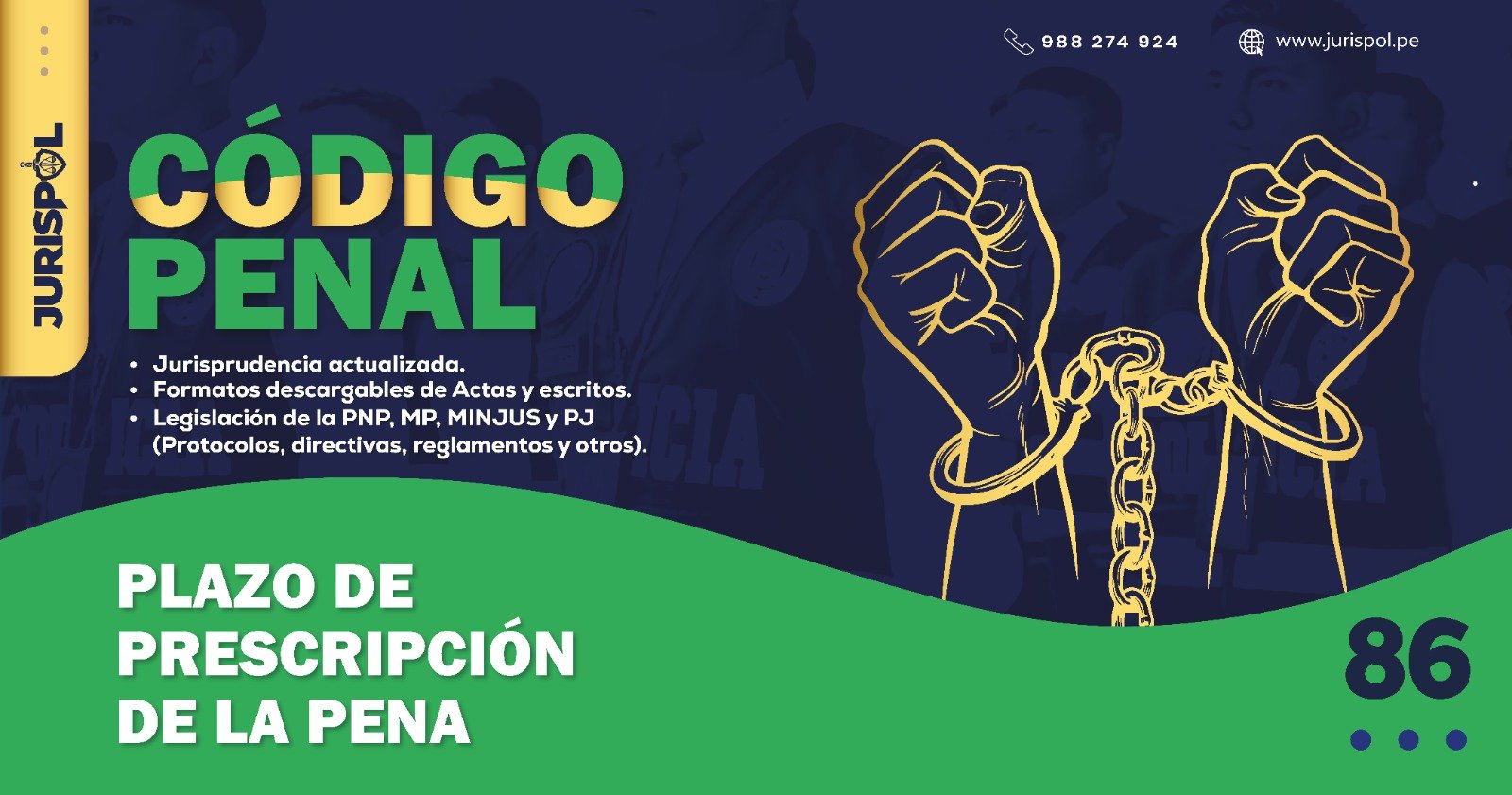 [Código Penal] En virtud del Decreto Legislativo 635, se promulgó el CÓDIGO PENAL PERUANO, a través del área de redacción y el observatorio jurídico de Jurisprudencia Policial – JURISPOL, se ha elaborado Jurisprudencia actual y esencial, una selección estratégica de criterios que permiten comprender y aplicar correctamente esta normativa, particularmente el Art. 86 .Plazo de prescripción de la pena.