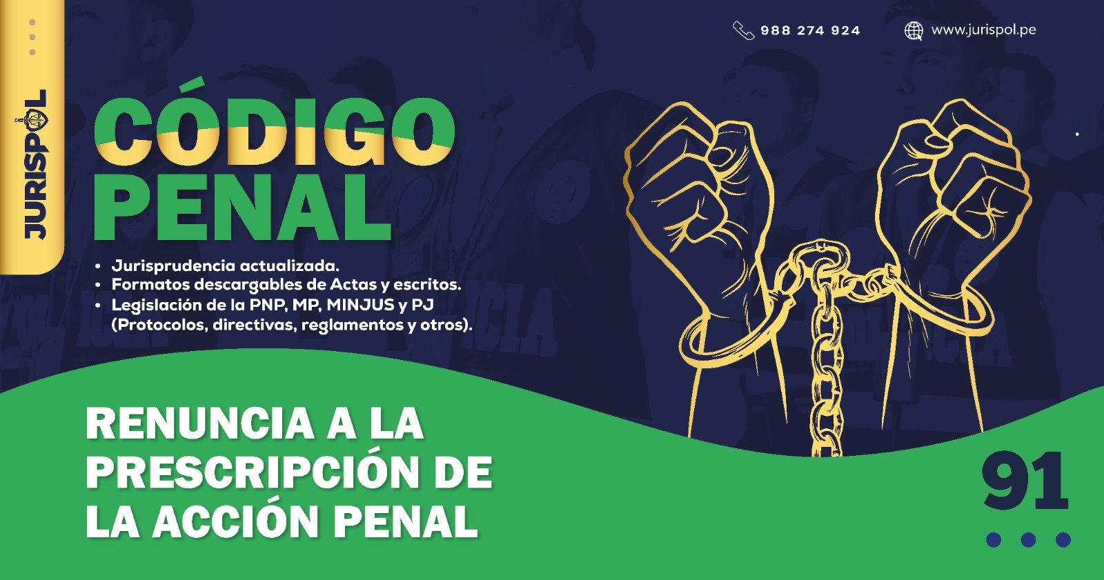 [Código Penal] En virtud del Decreto Legislativo 635, se promulgó el CÓDIGO PENAL PERUANO, a través del área de redacción y el observatorio jurídico de Jurisprudencia Policial – JURISPOL, se ha elaborado Jurisprudencia actual y esencial, una selección estratégica de criterios que permiten comprender y aplicar correctamente esta normativa, particularmente el Art. 91 .Renuncia a la prescripción de la acción penal.