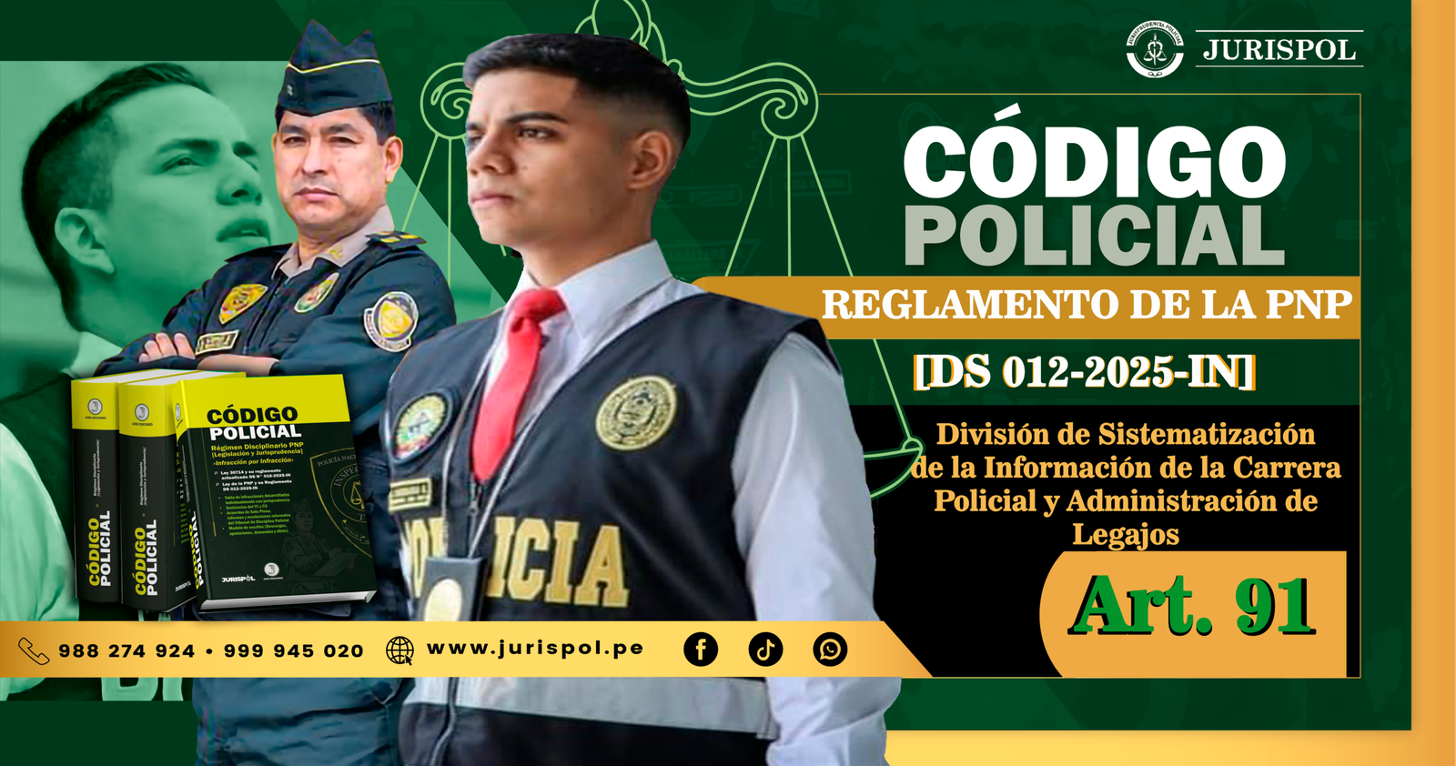 [Reglamento de la Ley de la PNP] Mediante el DS 012-2025-IN, publicado el 05NOV2025, se aprobó el Reglamento de la Ley de la Policía Nacional del Perú; a través del área de redacción y observatorio jurídico de Jurisprudencia Policial – JURISPOL, se ha elaborado y seleccionado criterios estratégicos que permiten aplicar correctamente esta normativa. Artículo 91. División de Sistematización de la Información de la Carrera Policial y Administración de Legajos.