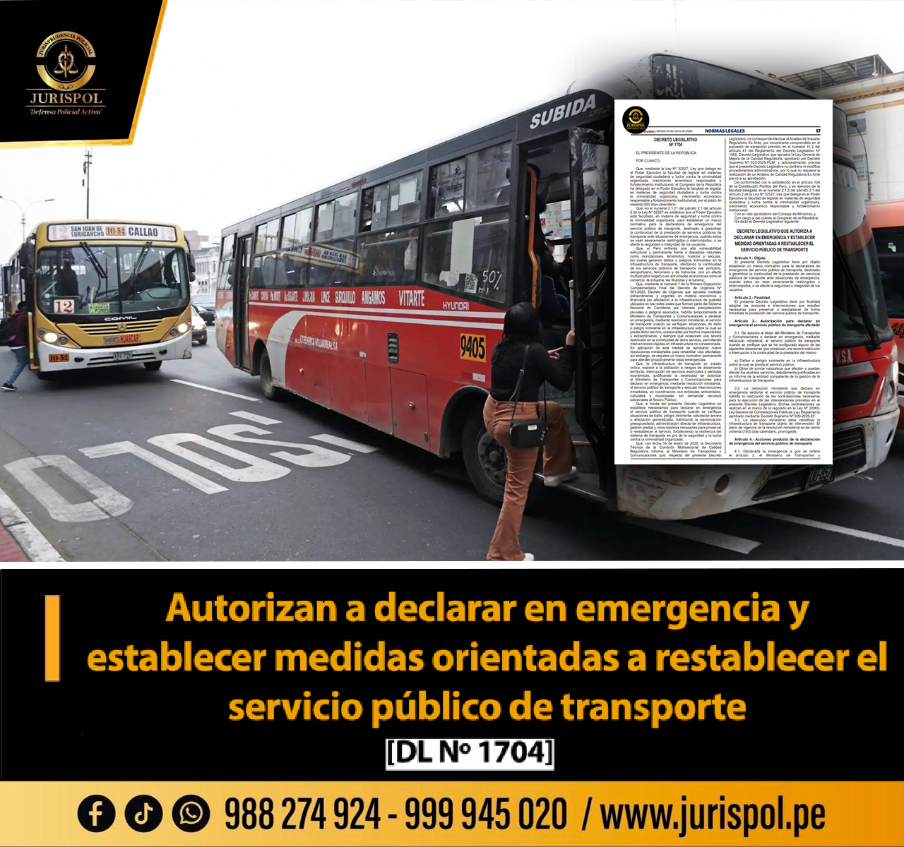 [Decreto Legislativo] Mediante el DL 1704, publicado el 24ENE2026, se autoriza declarar en emergencia el servicio público de transporte, con la finalidad de garantizar la continuidad de la prestación de servicios públicos de transporte ante situaciones de emergencia, cuando estos se vean severamente restringidos o interrumpidos, o se afecte la seguridad o integridad de los usuarios.  [DESCARGA AQUÍ]