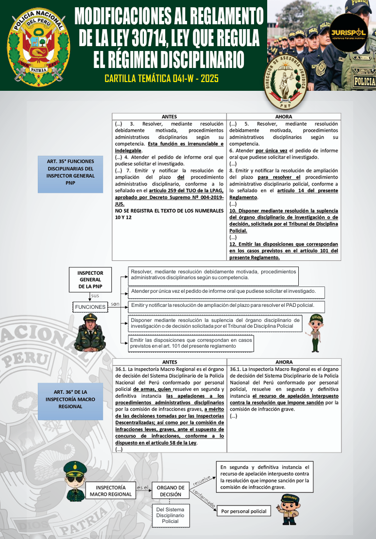 [Cartilla Temática PNP] Mediante La Dirección de Asesoría jurídica de la PNP, el 20ENE2026, oficializó la elaboración y difusión de la CARTILLA TEMÁTICA 041-W – 2025, desarrollando los artículos 35 y 36 del Reglamento de la Ley 30714, como herramienta técnica y especializada de carácter jurídico para el empoderamiento del servicio policial.