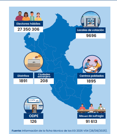 Mediante el Decreto Supremo n.º 039-2025-PCM, la Presidencia de la República convocó a Elecciones Generales para el domingo 12 de abril de 2026. En ellas se elegirá al presidente y a los vicepresidentes de la República, así como a los senadores y diputados del Congreso y a los representantes peruanos ante el Parlamento Andino.