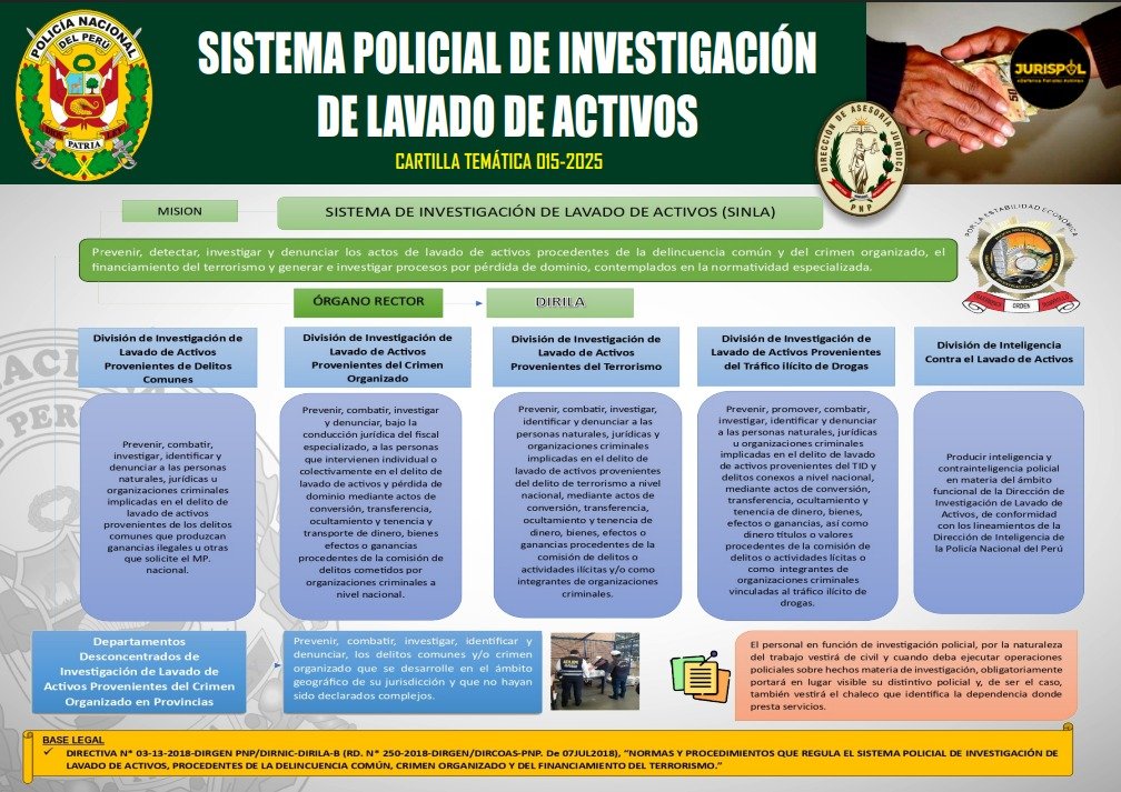 El Sistema Policial de Investigación de Lavado de Activos de la Policía Nacional del Perú (SINLA PNP) está conformado por el conjunto de Unidades Orgánicas Especializadas a nivel nacional, integradas funcionalmente, cuya misión es prevenir, detectar, investigar y denunciar los actos de lavado de activos procedentes de la delincuencia común y del crimen organizado, el financiamiento del terrorismo y generar e investigar procesos por pérdida de dominio, contemplados en la normatividad especializada.