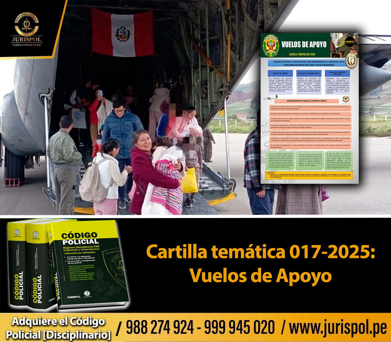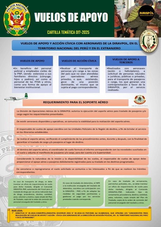 - Directiva N.° 05-2024-comoppol/DIRAVPOL-DIVOPAER (RCG N° 94-2024-CG PNP/EMG DEL 01ABR2024, que aprueba los «Lineamientos para realización de vuelos de apoyo y acción – cívica con aeronaves de la dirección de aviación policial, en el territorio Nacional del Perú en el extranjero».