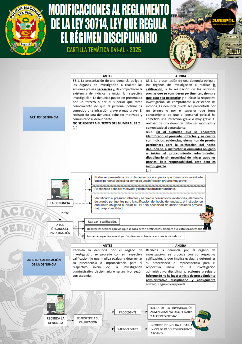 [Cartilla Temática PNP] Mediante La Dirección de Asesoría jurídica de la PNP, el 23ENE2026, oficializó la elaboración y difusión de la CARTILLA TEMÁTICA 041-AL – 2025, desarrollando los artículos 83 y 85 del Reglamento de la Ley 30714, como herramienta técnica y especializada de carácter jurídico para el empoderamiento del servicio policial.