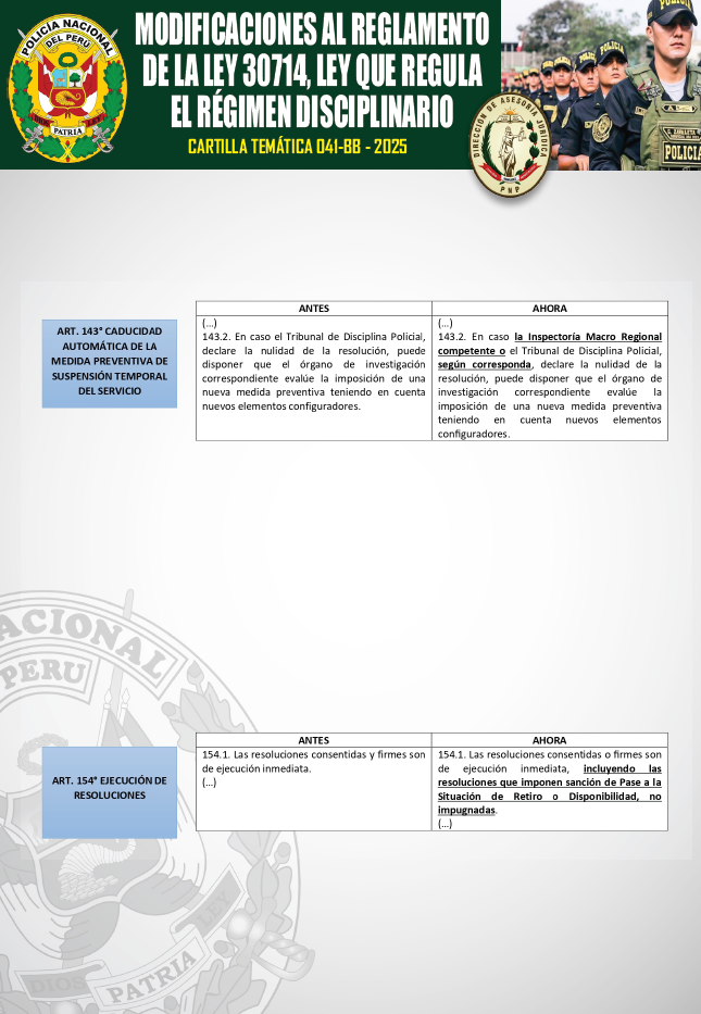 [Cartilla Temática PNP] Mediante La Dirección de Asesoría jurídica de la PNP, el 23ENE2026, oficializó la elaboración y difusión de la CARTILLA TEMÁTICA 041-BB-2025, desarrollando los artículos 143 y 154 del Reglamento de la Ley 30714, como herramienta técnica y especializada de carácter jurídico para el empoderamiento del servicio policial. ⇒DESCARGA AQUÍ⇐