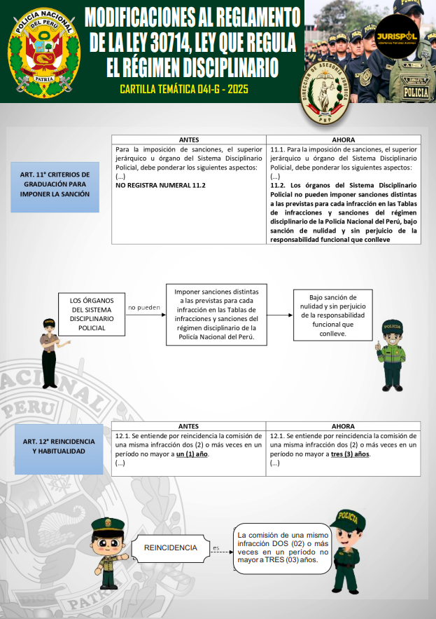 [Cartilla Temática PNP] Mediante La Dirección de Asesoría jurídica de la PNP, el 13ENE2025, oficializó la elaboración y difusión de la CARTILLA TEMÁTICA 041-G – 2025, desarrollando el artículo 11 y 12 del Reglamento de la Ley 30714, como herramienta técnica y especializada de carácter jurídico para el empoderamiento del servicio policial.