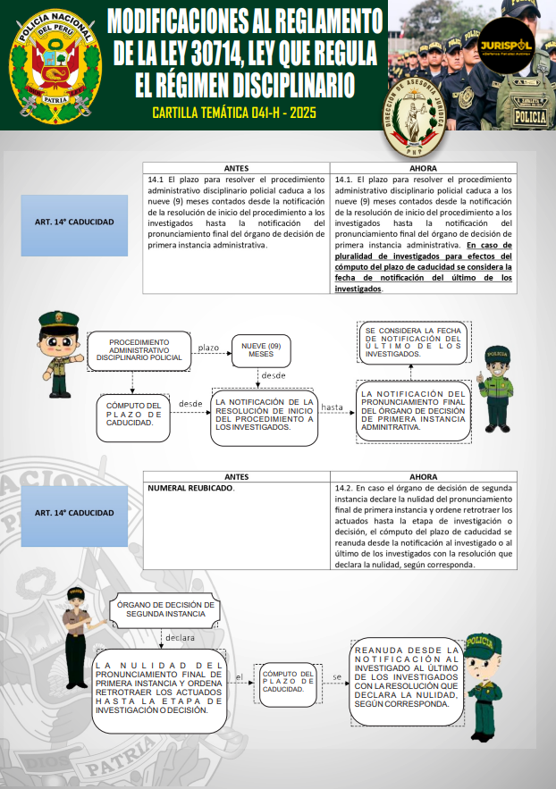 [Cartilla Temática PNP] Mediante La Dirección de Asesoría jurídica de la PNP, el 13ENE2025, oficializó la elaboración y difusión de la CARTILLA TEMÁTICA 041-H – 2025, desarrollando el artículo 14 del Reglamento de la Ley 30714, como herramienta técnica y especializada de carácter jurídico para el empoderamiento del servicio policial.