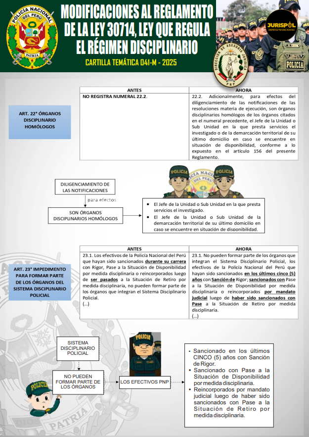 [Cartilla Temática PNP] Mediante La Dirección de Asesoría jurídica de la PNP, el 14ENE2025, oficializó la elaboración y difusión de la CARTILLA TEMÁTICA 041-M – 2025, desarrollando el artículo 22 y 23 del Reglamento de la Ley 30714, como herramienta técnica y especializada de carácter jurídico para el empoderamiento del servicio policial.