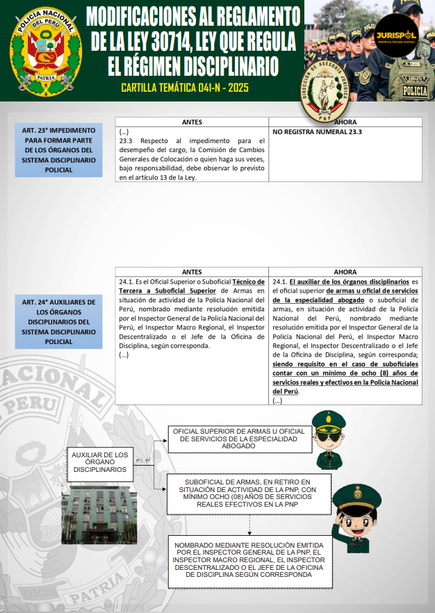 [Cartilla Temática PNP] Mediante La Dirección de Asesoría jurídica de la PNP, el 14ENE2025, oficializó la elaboración y difusión de la CARTILLA TEMÁTICA 041-N – 2025, desarrollando el artículo 23 y 24 del Reglamento de la Ley 30714, como herramienta técnica y especializada de carácter jurídico para el empoderamiento del servicio policial.