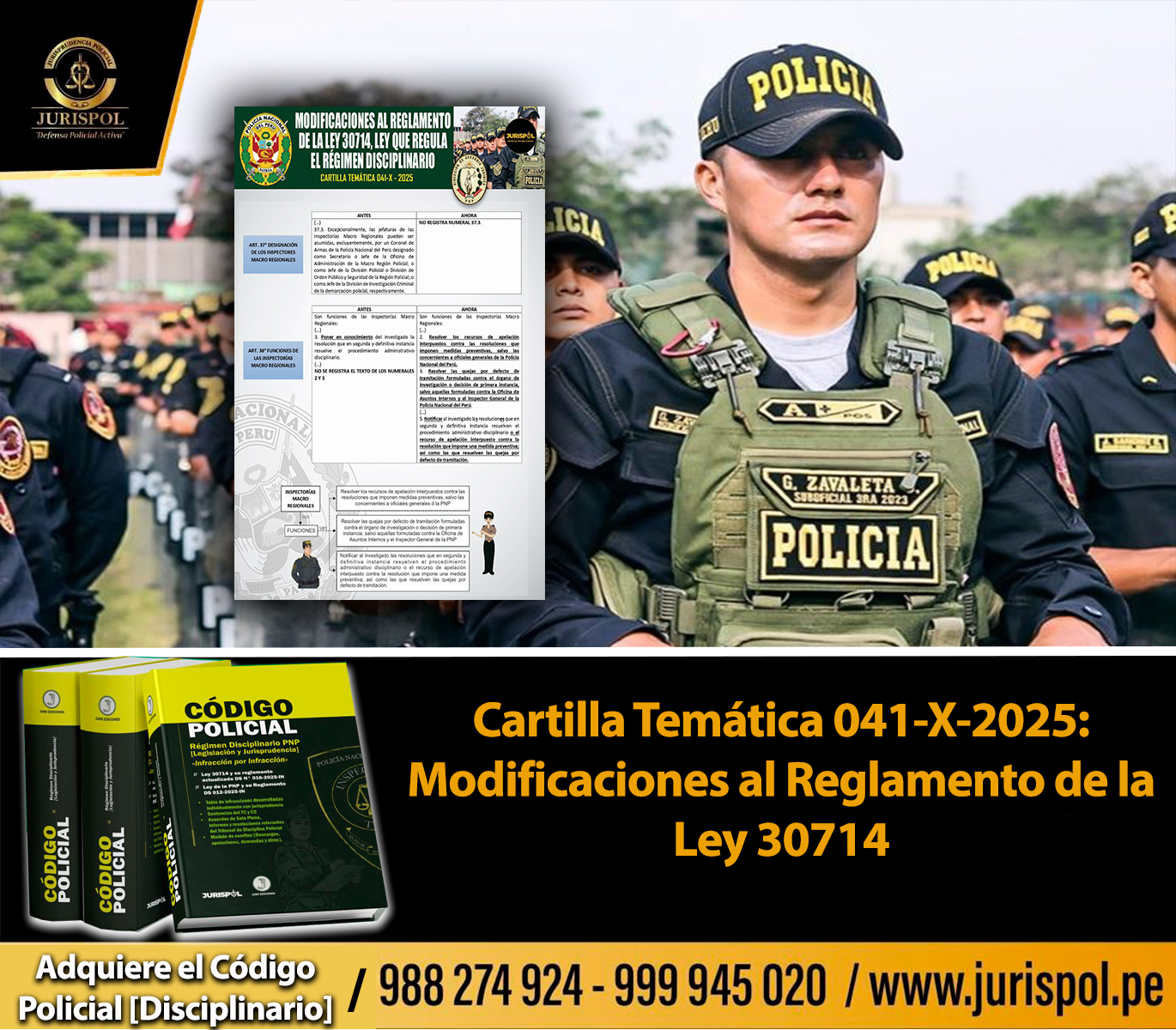 [Cartilla Temática PNP] Mediante La Dirección de Asesoría jurídica de la PNP, el 22ENE2026, oficializó la elaboración y difusión de la CARTILLA TEMÁTICA 041-X-2025, desarrollando los artículos 37 y 38 del Reglamento de la Ley 30714, como herramienta técnica y especializada de carácter jurídico para el empoderamiento del servicio policial.