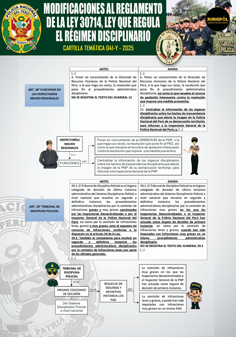 [Cartilla Temática PNP] Mediante La Dirección de Asesoría jurídica de la PNP, el 22ENE2026, oficializó la elaboración y difusión de la CARTILLA TEMÁTICA 041-Y -2025, desarrollando los artículos 38 y 39 del Reglamento de la Ley 30714, como herramienta técnica y especializada de carácter jurídico para el empoderamiento del servicio policial.