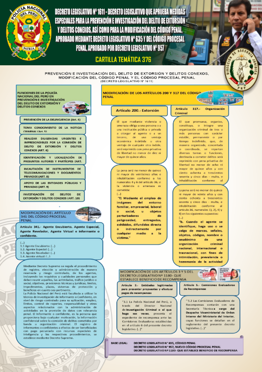 Cartilla temática PNP 376-2024: DL 1611 -DL que aprueba medidas especiales para la prevención e investigación del delito de extorsión y delitos conexos, así como para la modificación del código penal, aprobado mediante dl 635 y del código procesal penal, aprobado por DL 957