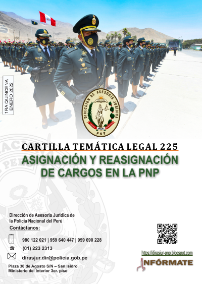 [Cartilla Temática PNP] Mediante La Dirección de Asesoría jurídica de la PNP, el 17ENE2022, oficializó la elaboración y difusión de la CARTILLA TEMÁTICA LEGAL 225-2022,como herramienta técnica y especializada de carácter jurídico para el empoderamiento del servicio policial. ⇒DESCARGA AQUÍ⇐