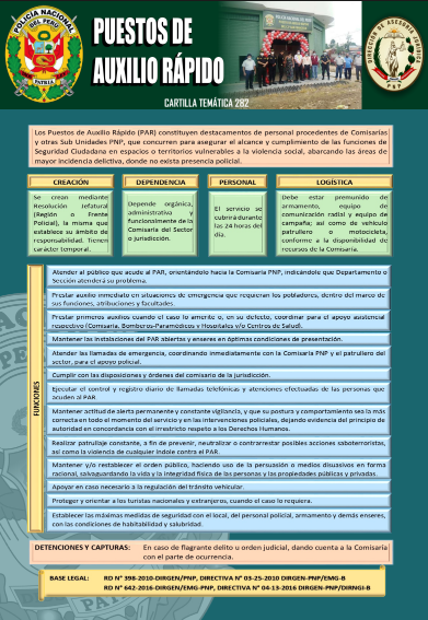 1. Los Puestos de Auxilio Rápido (PAR) (…) constituyen destacamentos de personal procedentes de Comisarias y otras Sub Unidades PNP, que concurren para asegurar el alcance y cumplimiento de las funciones de Seguridad Ciudadana en espacios o territorios vulnerables a la violencia social; dichas Sub Unidades (destacamentos) tienen carácter temporal, se crean mediante Resolución Jefatural (Región o Frente Policial), la misma que establece su ámbito de responsabilidad, pueden funcionar en locales de propiedad del Ministerio del Interior Policia Nacional del Perú, Gobiernos Regionales y Locales, Centros Poblados, Comunidades Campesinas y otros que reúnan óptimas condiciones de seguridad y habitabilidad.
