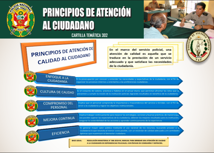 - RESOLUCIÓN MINISTERIAL N° 586-2019-IN, MANUAL PARA BRINDAR UNA ATENCIÓN DE CALIDAD A LA CIUDADANÍA EN DEPENDENCIAS POLICIALES, CON ÉNFASIS EN COMISARÍAS Y DEPINCRIS.