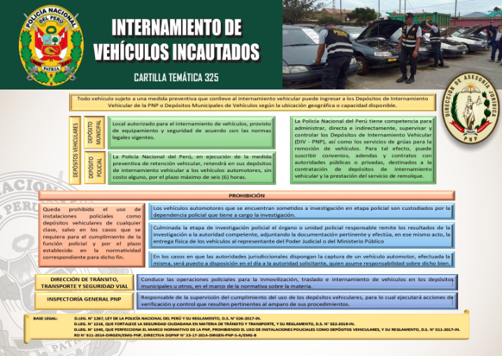 - D. LEG. N 1340, QUE PERFECCIONA EL MARCO NORMATIVO DE LA PNP, PROHIBIENDO EL USO DE INSTALACIONES POLICIALES COMO DEPÓSITOS VEHICULARES, Y SU REGLAMENTO, D.S. N 011-2017-IN [Clic aquí]
