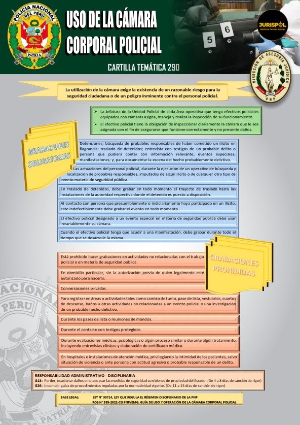- Resolución de Comandancia General N.° 555-2022-CG PNP/EMG, Guía de uso y operación de la cámara corporal policial.