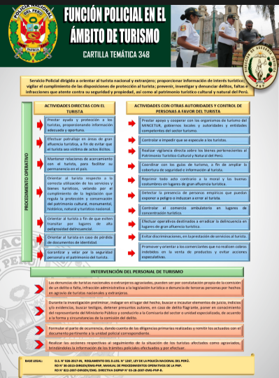 La Dirección de Turismo es el órgano especializado, de carácter técnico y sistémico, normativo y operativo; responsable de planear, organizar, dirigir, ejecutar, coordinar, controlar y supervisar las actividades y operaciones policiales de orientación, seguridad, protección, prevención, investigación y denuncia de faltas y delitos en agravio de los turistas extranjeros y sus bienes, bajo la conducción jurídica del fiscal; así como, la protección y seguridad de los bienes patrimoniales, históricos, culturales y turísticos a nivel nacional; de conformidad con la normativa sobre la materia.