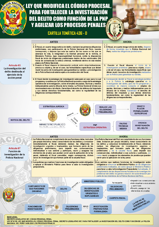 [Cartilla Temática PNP] Mediante La Dirección de Asesoría jurídica de la PNP, el 10OCT2024, oficializó la elaboración y difusión de la CARTILLA TEMÁTICA 436-D-2024, desarrollando los artículos 65 Y 67 de la Ley que Modifica el Código Procesal, para Fortalecer la Investigación del Delito como Función de la PNP y Agilizar los Procesos Penales»; como herramienta técnica y especializada de carácter jurídico para el empoderamiento del servicio policial. ⇒DESCARGA AQUÍ⇐