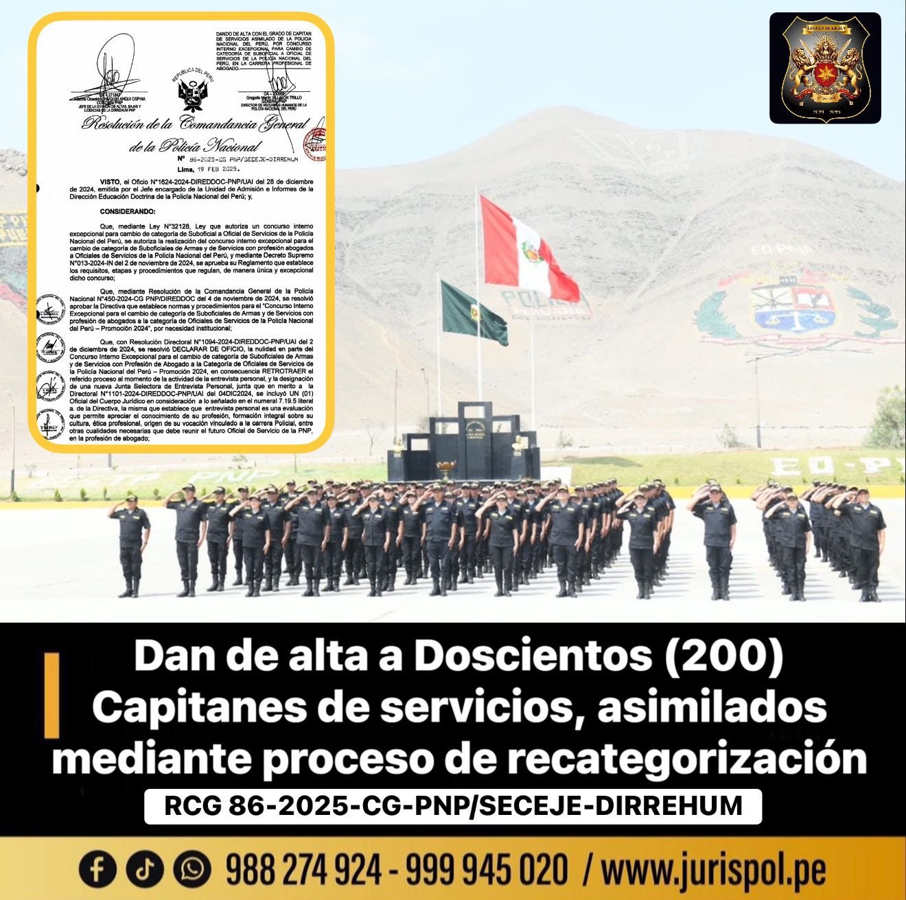 [Resoluciones PNP] Mediante la RM N° 86-2025-CG-PNP/SECEJE-DIRREHUM, de fecha 19FEB2025, a través de la Comandancia General PNP, «se aprobó a doscientos (200) capitanes de servicios, asimilados mediante proceso de recategorización» ⇒DESCARGA AQUÍ⇐