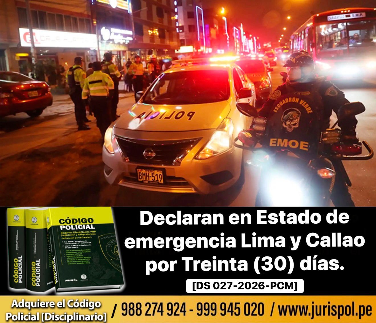 |Decreto Supremo| Mediante el DS 027-2026-PCM, publicado en el diario oficial «El Peruano», el 27 de febrero de 2026, donde se declara Estado de Emergencia en Lima Metropolitana del departamento de Lima y en la Provincia Constitucional del Callao. ⇒DESCARGA AQUÍ⇐
