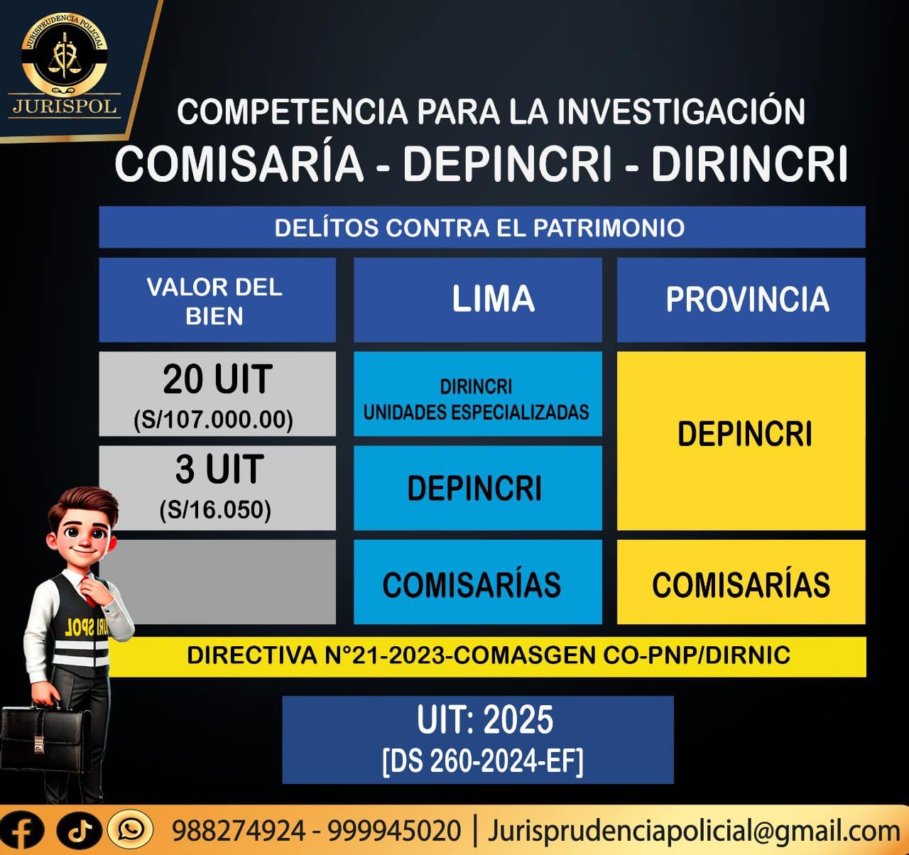 7.4.3.2 Los Departamentos de Investigación de Lima, investigan y denuncian los delitos contra el patrimonio cometidos en su jurisdicción, cuyo monto sea superior a tres (03) y menor a veinte (20) Unidades Impositivas Tributarias (UIT). Al interior del país los DEPINCRIS también investigan las denuncias de delitos contra el patrimonio cuyo monto supere las 20 UIT.