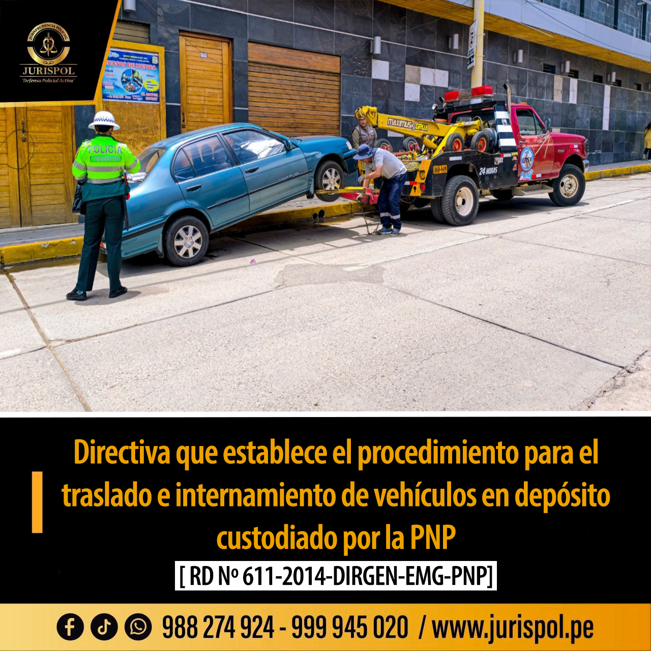 [Directivas PNP] Mediante la RD Nº 611-2014-DIRGEN-EMG-PNP, de fecha 01 de julio de 2014, a través de la Dirección General de la PNP, se aprobó la Directiva DGPNP Nº 23-17-2014-DIRGEN-PNP-S-A/EMG-B «Directiva que establece procedimiento para el traslado e internamiento provisional de vehículos en depósitos custodiados por la PNP» ⇒DESCARGA AQUÍ⇐