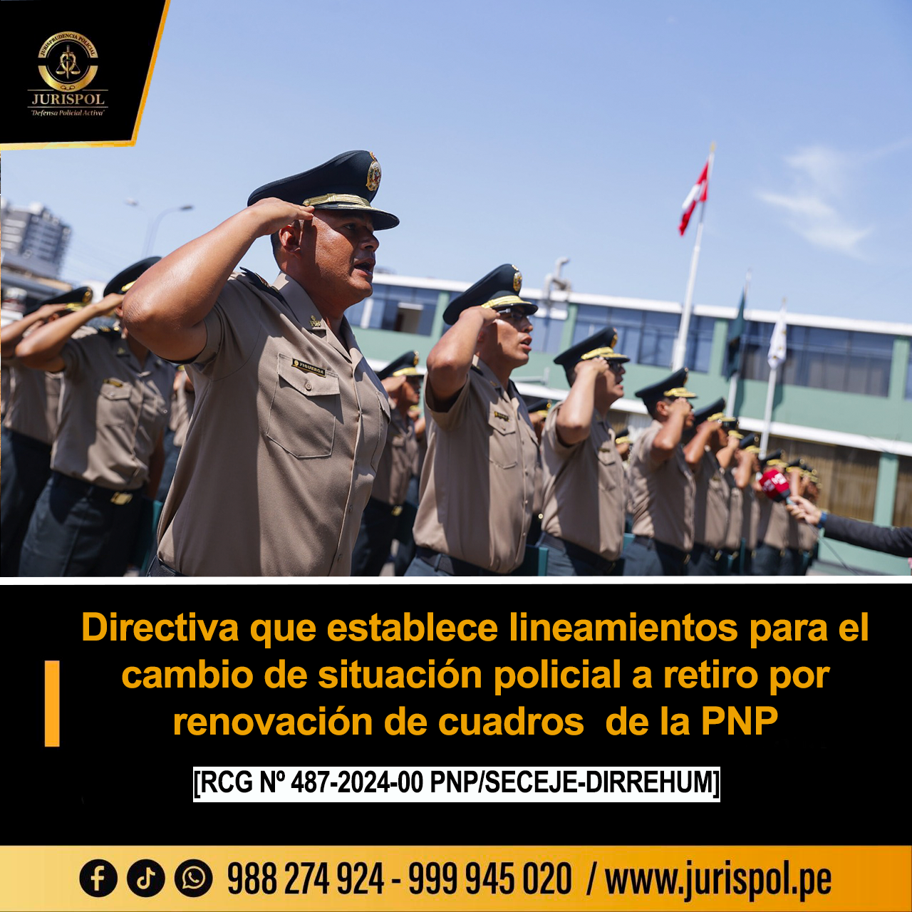[Directivas PNP] Mediante la RCG Nº 487-2024-00 PNP/SECEJE-DIRREHUM, de fecha 19 de noviembre de 2024, a través de la comandancia General de la PNP, se aprobó la Directiva 28 -2024-COMGEN-PNP/DIRREHUM-DIVABL «Directiva que establece lineamientos para evaluar y proponer el cambio de situación policial de actividad a la de retiro por la causal de renovación de cuadros por proceso regula en las jerarquías de oficiales generales y oficiales superiores de armas y de servicios de la Policía Nacional del Perú» ⇒DESCARGA AQUÍ⇐