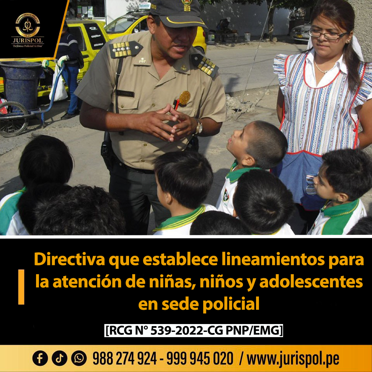 [Directivas PNP] Mediante la RCG N° 539-2022-CG PNP/EMG, de fecha 20 de diciembre de 2022, a través de la Comandancia General de la PNP, se aprobó «Directiva que establece lineamientos para la atención de niñas, niños y adolescentes en sede Policial» ⇒DESCARGA AQUÍ⇐