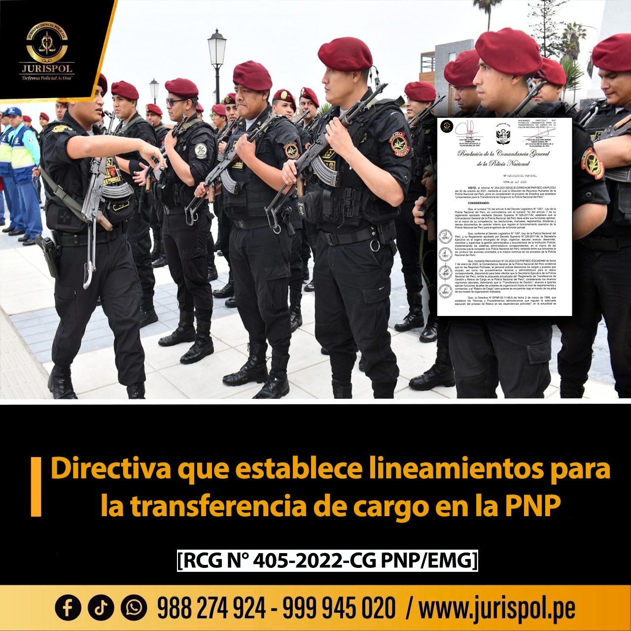 [Directivas PNP] Mediante la RCG N° 405-2022-CG PNP/EMG, de fecha 08 de de octubre de 2022, a través de la Comandancia General de la PNP, se aprobó «Directiva que establece lineamientos para la transferencia de cargo en la PNP» ⇒DESCARGA AQUÍ⇐
