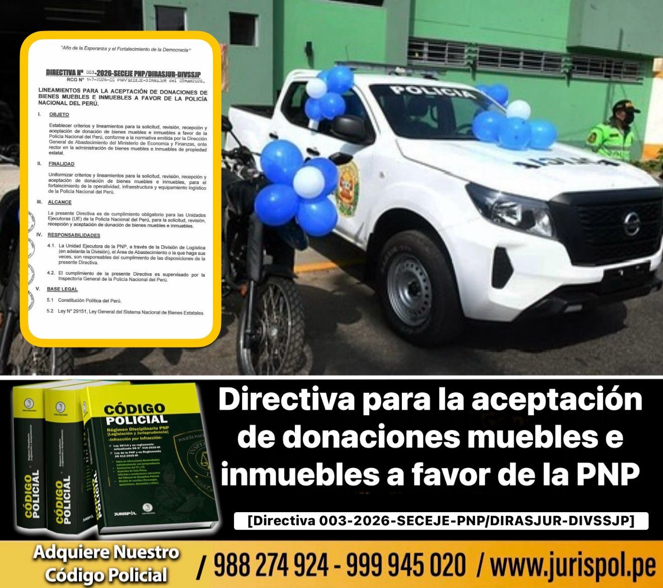 [Directivas PNP] En virtud de la RCG. N° 147-2026-CG PNP/SECEJE-DIRASJUR, de fecha 05MAR2026, se aprobó la Directiva 003-2026-SECEJE PMP/DIRASJUR-DIVSSJP que establece «Lineamientos y procedimientos para la aceptación de donaciones de bienes muebles e inmuebles a favor de la Policía Nacional del Perú». ⇒DESCARGA AQUÍ⇐