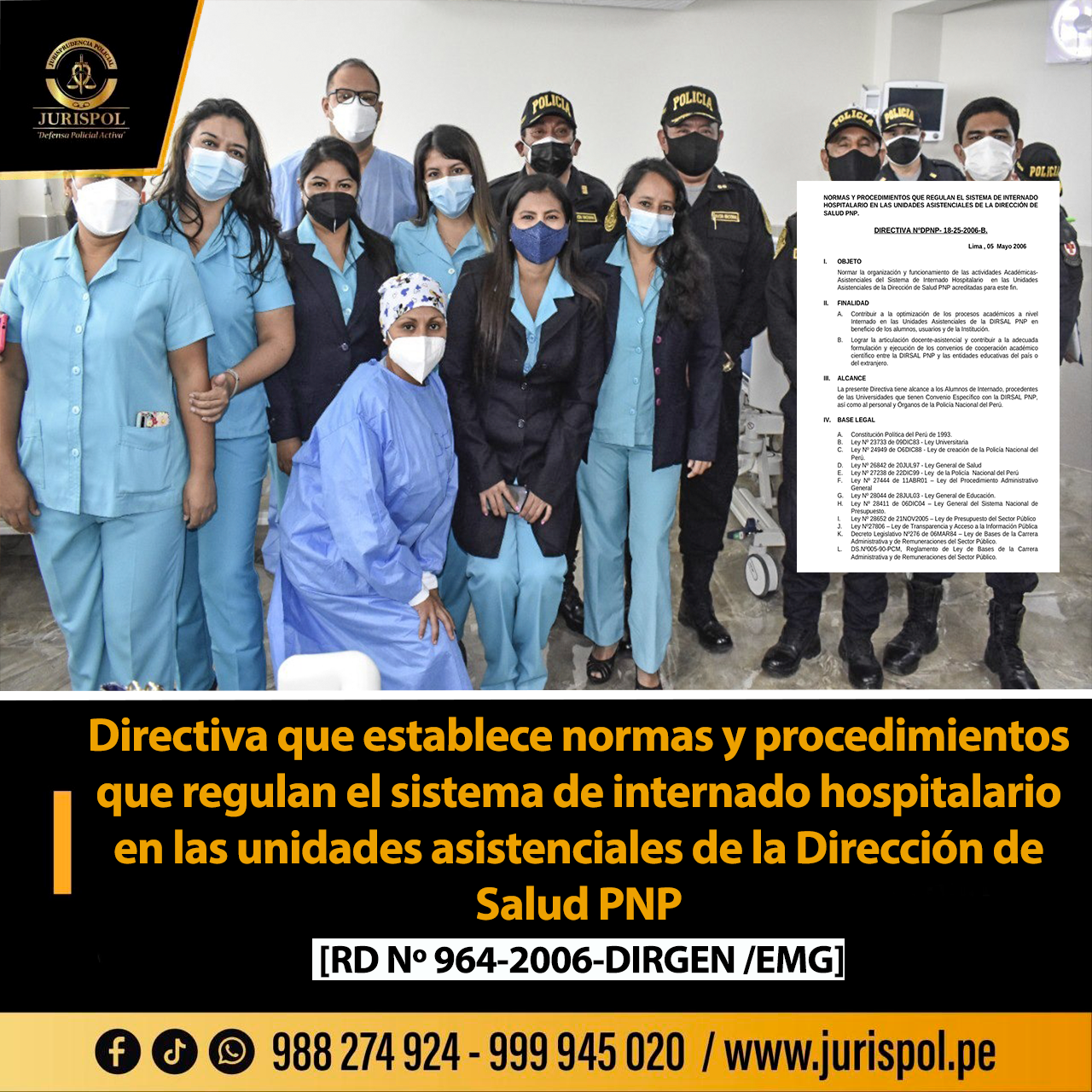 [Directivas PNP] Mediante la RD Nº 964-2006-DIRGEN /EMG, del 05 de mayo de 2006, a través de la Dirección General de la PNP, se aprobo la Directiva DPNP- 18-25-2006-B «Directiva que establece normas y procedimientos que regulan el sistema de internado hospitalario en las unidades asistenciales de la Dirección de Salud PNP» ⇒DESCARGA AQUÍ⇐