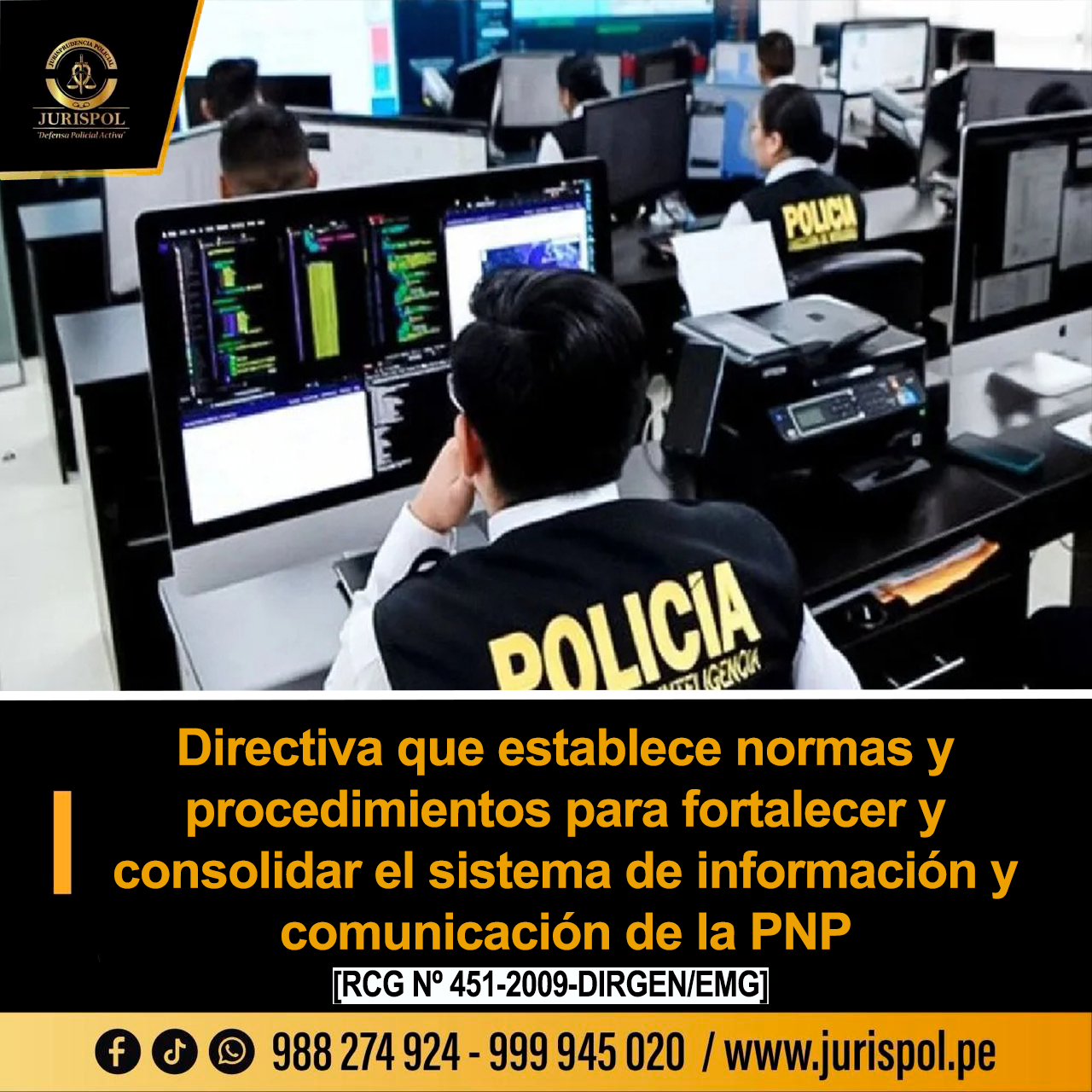 [Directivas PNP] Mediante la RCG Nº 451-2009-DIRGEN/EMG, de fecha 06 de mayo de 2009, a través de la Comandancia General de la PNP, se aprobó la Directiva Nº 10-13-2009-DINFO-PNP-B «Directiva que establece normas y procedimientos para fortalecer y consolidar el Sistema de Información y Comunicación de la Policía Nacional del Perú» ⇒DESCARGA AQUÍ⇐
