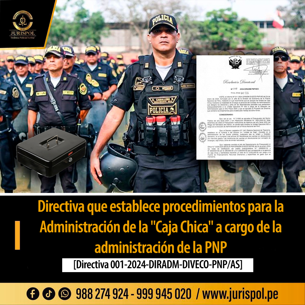 [Directivas PNP] Mediante la RD N° 028-2024-DIRADM-PNP/SEC, de fecha 28 de enero de 2024, a través de la Dirección General de la PNP, se aprobó la Directiva 001-2024-DIRADM-DIVECO-PNP/AS «Directiva que establece Normas y procedimientos a aplicarse en los diversos procesos técnicos para la administración de la «Caja Chica» con cargo a la fuente de financiamiento Recursos Ordinarios de la Unidad Ejecutora (UE) 002 a cargo de la Dirección de Administración PNP, Año Fiscal (AF) 2024, destinado para las direcciones y unidades policiales.» ⇒DESCARGA AQUÍ⇐