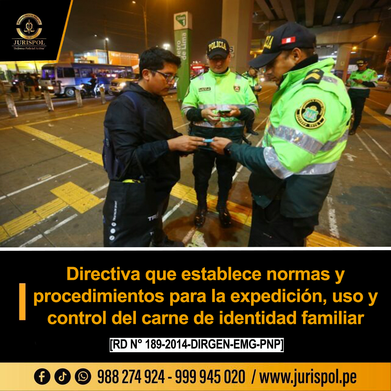 [Directivas PNP] Mediante la RD N° 189-2014-DIRGEN-EMG-PNP, de fecha 07 de marzo de 2014, a través del Dirección General de la PNP, se aprobó la Directiva 01-08-2014-DIRGEN/DIREJEPER-PNP-B «Directiva que establece normas y procedimientos para la expedición, uso y control del carne de identidad familiar» ⇒DESCARGA AQUÍ⇐