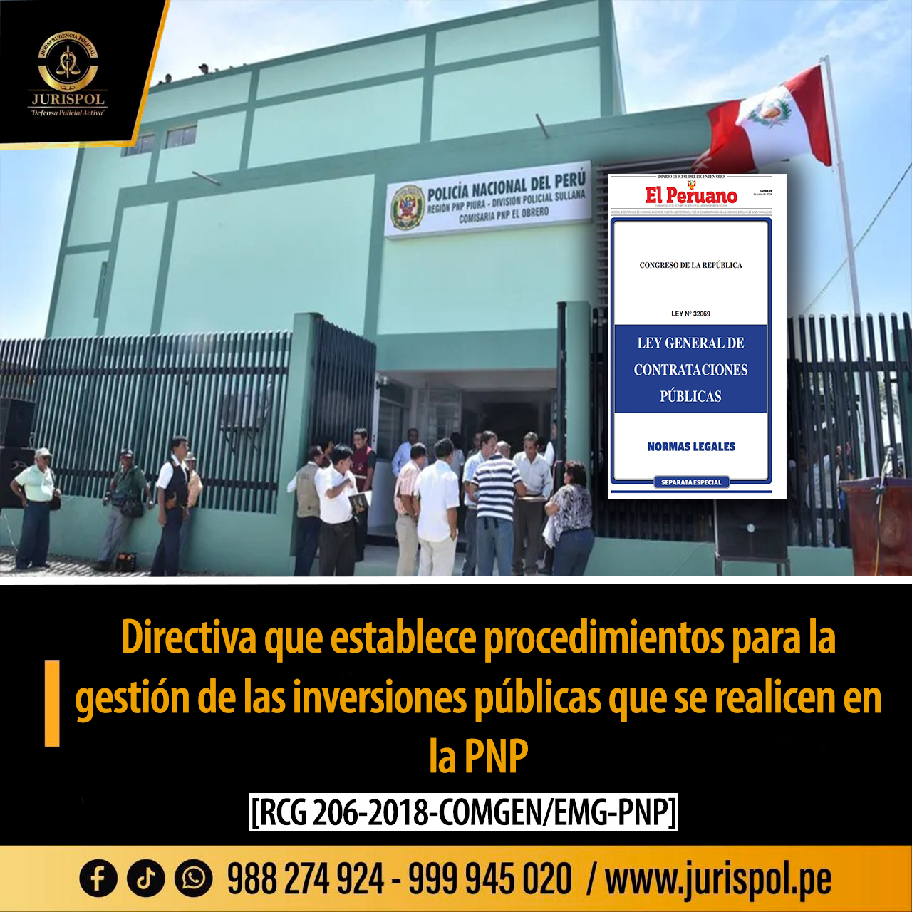 [Directivas PNP] Mediante la RCG N° 206-2018-COMGEN/EMG.PNP, de fecha 07 de diciembre de 2018, a través de la Comandancia General de la PNP, se aprobó la directiva «Directiva que establece normas y procedimientos para la gestión de las inversiones públicas que se realicen en la Policía Nacional del Perú» ⇒DESCARGA AQUÍ⇐