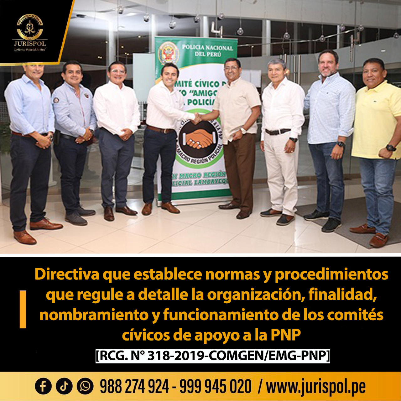 Que, la Directiva establece normas, criterios, procedimientos que regulen a detalle la organización, finalidad, nombramiento y funcionamiento de los Comités Cívicos de Apoyo «Amigos de la Policía con las Dependencias de la Policía Nacional del Perú;